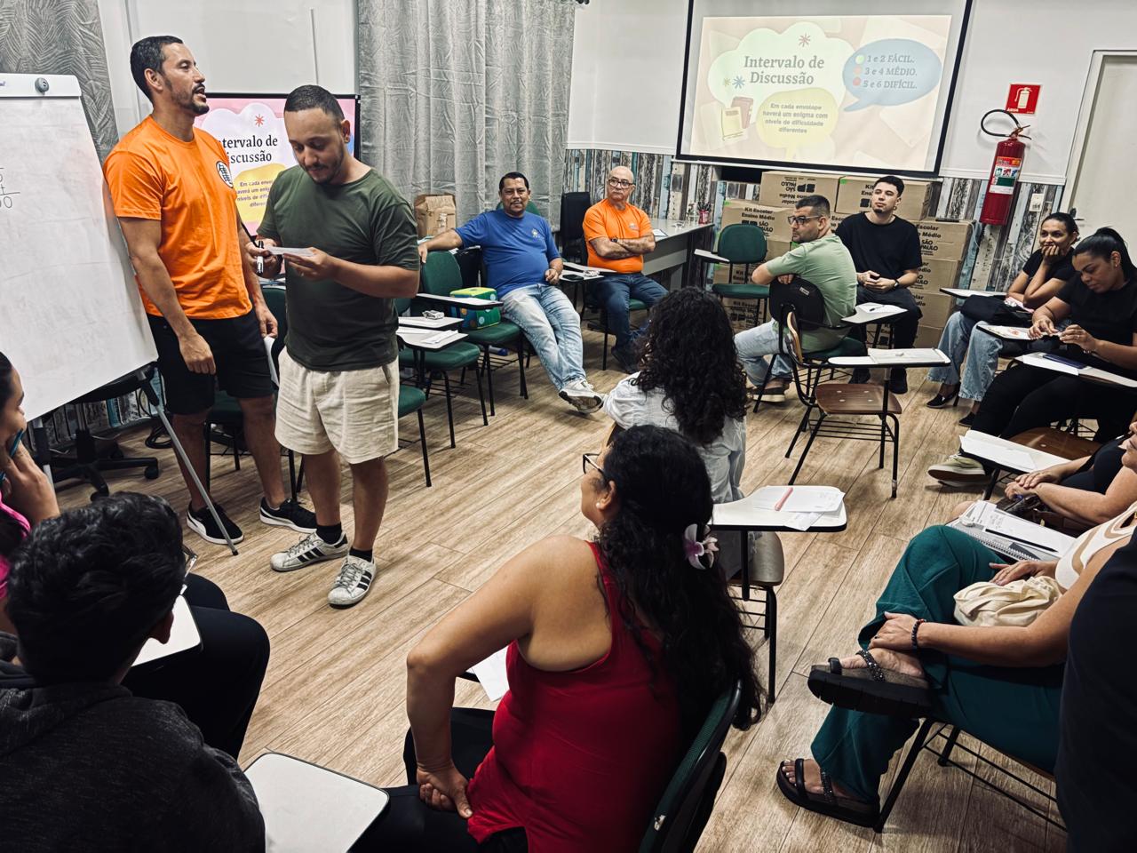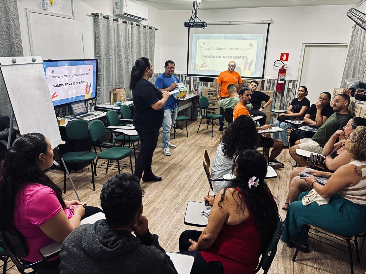 A oficina começou com uma conversa em que os alunos falaram sobre situações do dia a dia em que usam a Matemática, como nas compras, no trabalho ou para organizar gastos. Depois disso, eles foram divididos em grupos. Cada grupo lançou um dado para sortear um problema matemático que deveria resolver. Em seguida, os grupos apresentaram para os colegas como chegaram à resposta, permitindo a troca de ideias e diferentes formas de resolver o mesmo problema.